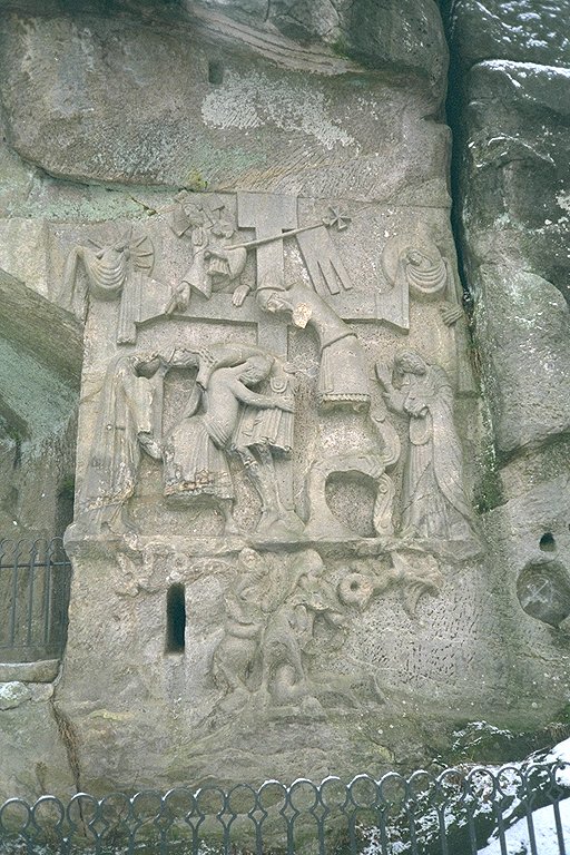 Das Kreuzabnahmerelief. Beachte die Luftschachtöffnung unten links.
