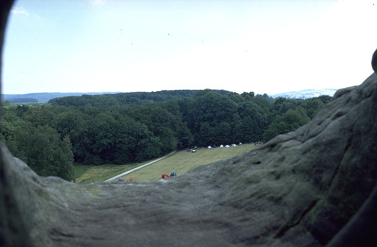Blick durch das Sonnenloch auf die Zelte der zu Mittsommer Angereisten.