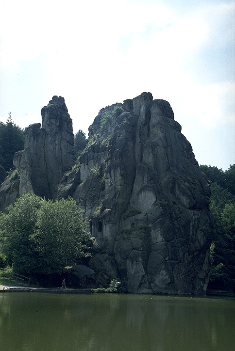 Fels 1 von jenseits des Teiches aus. Über dem Grab sieht man das Fenster der Nebengrotte.